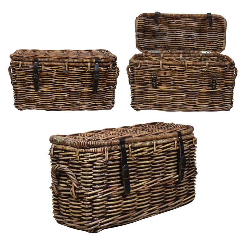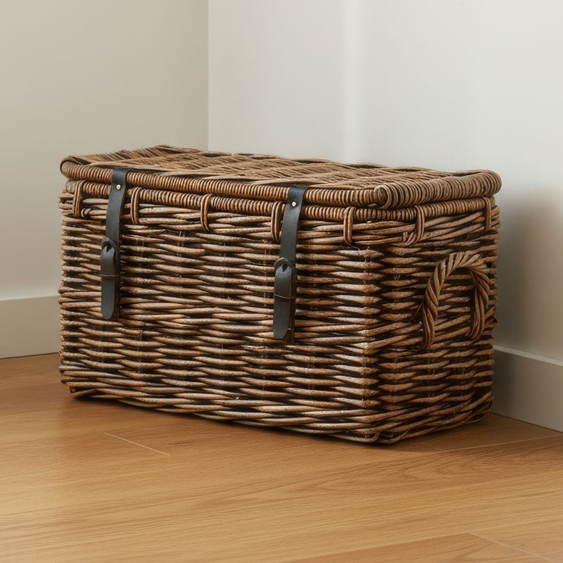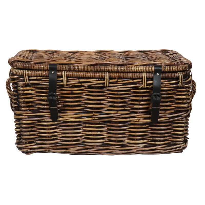 De opbergmand heeft een rechthoekige vorm en is handgemaakt van rotan.