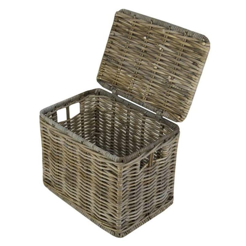 De opbergmand heeft een rechthoekige vorm en is gemaakt van rotan.