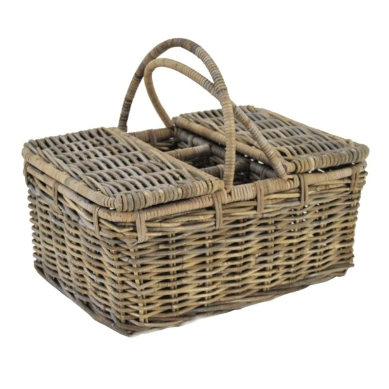 Deze praktische picknickmand heeft drie vakken waar flessen in kunnen en twee grotere vakken. Ook heeft de picknickmand twee hengsels, deksels en een rechthoekige vorm. Hij is met de hand gemaakt van rotan.