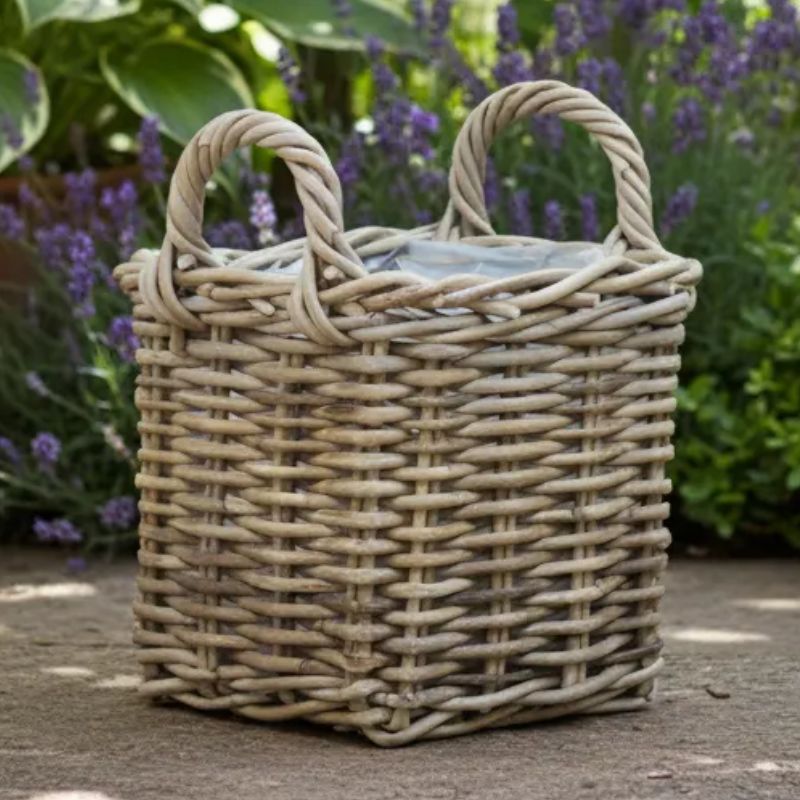 De plantenmand heeft een vierkante vorm, twee hengsels en een voering van plastic. De mand is met de hand gemaakt van rotan.
